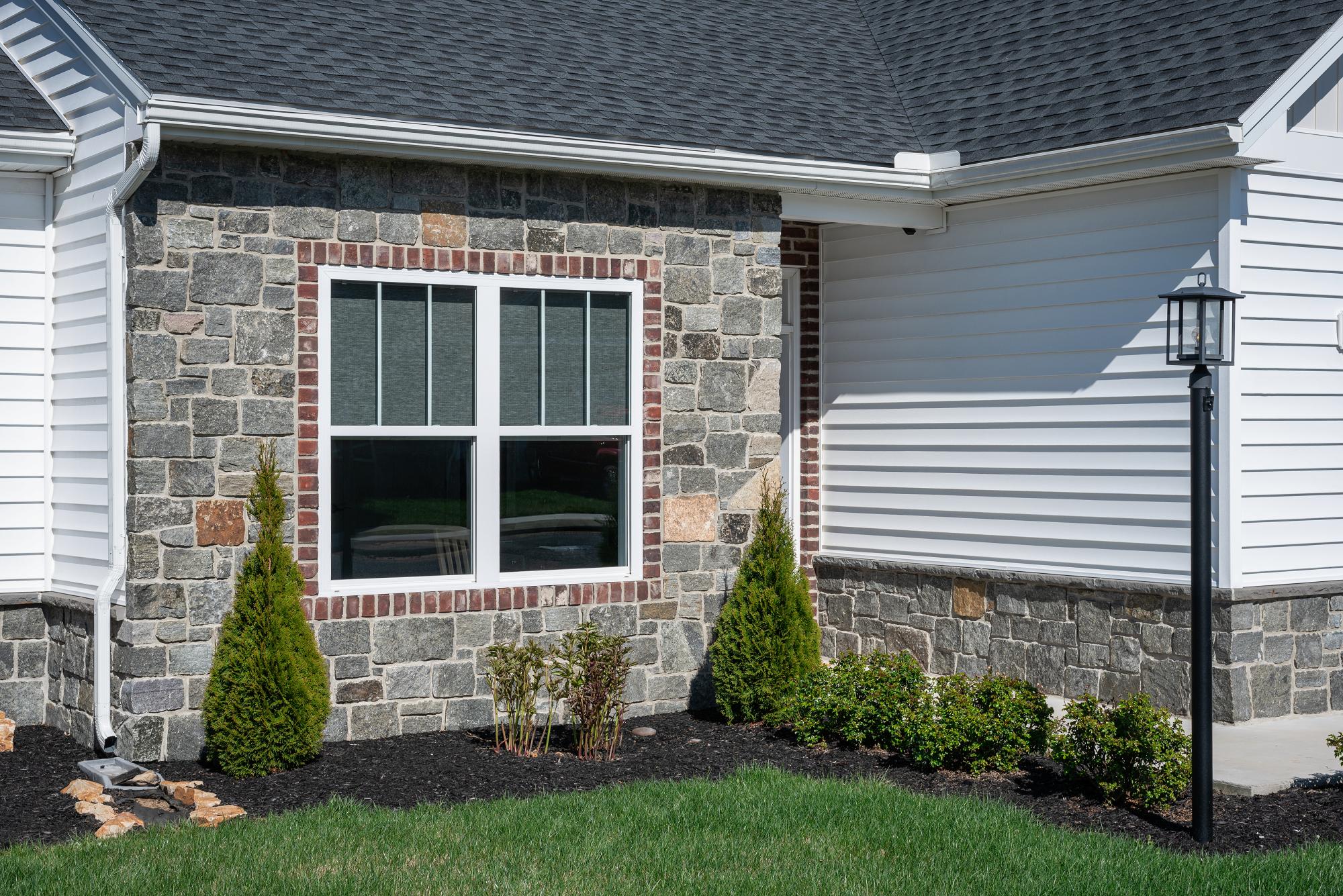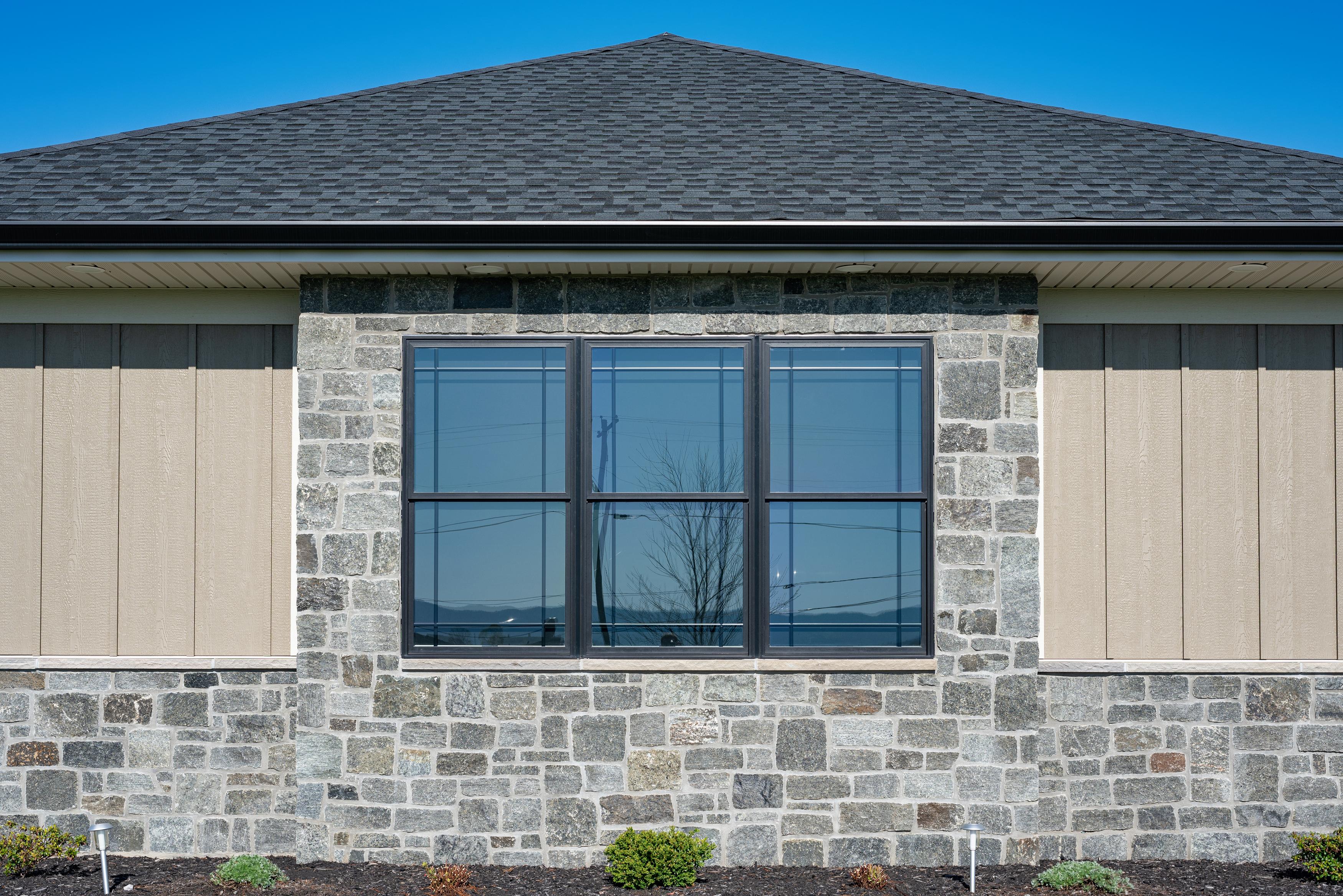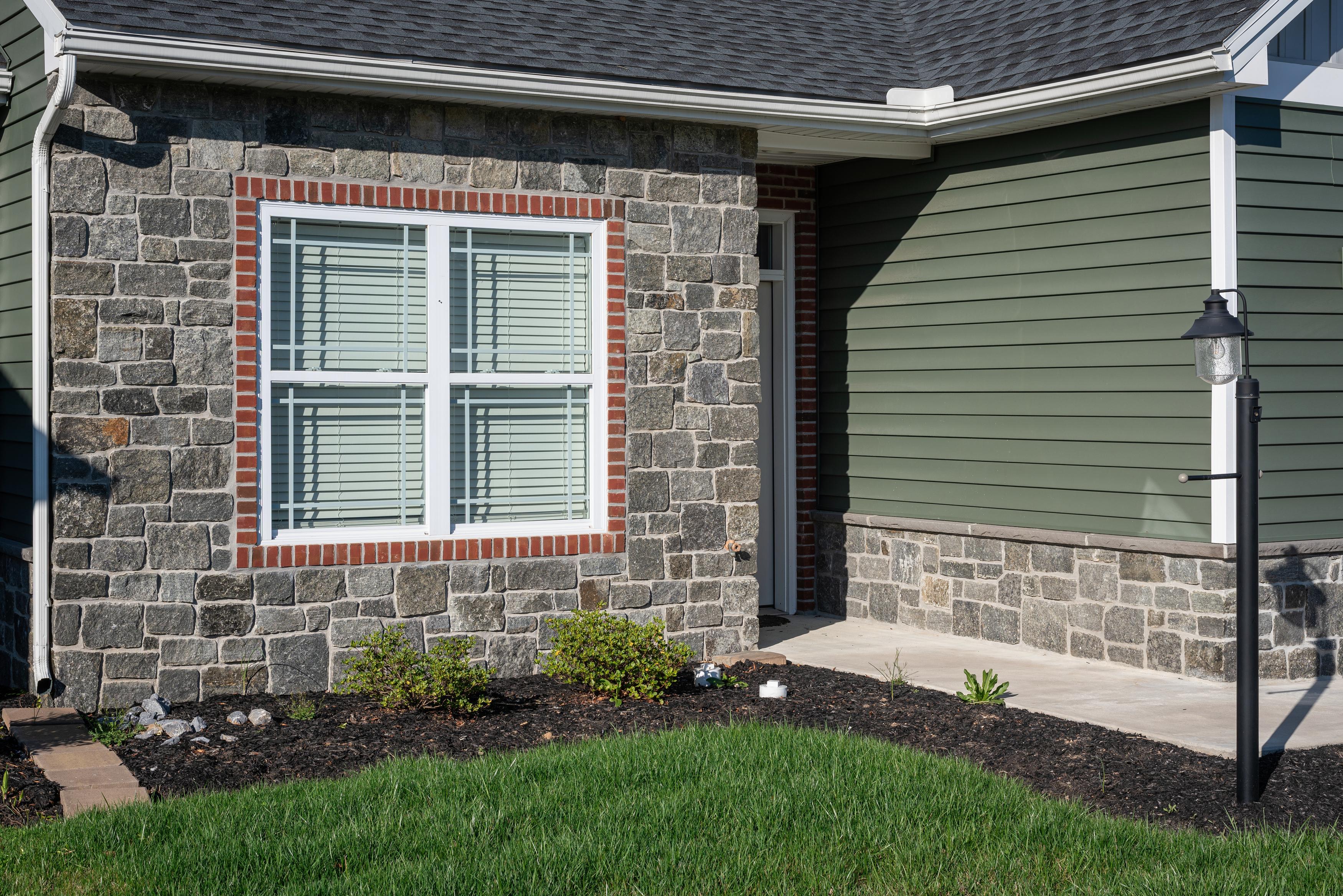 Castle Deep River features large format square and rectangular shaped pieces as well as split faced ashlar style pieces. It has a deep blue-green color with some occasional rust tones. It is typically installed with a mortar joint, but it may be installed in a dry-stacked style with additional cutting and fitting.